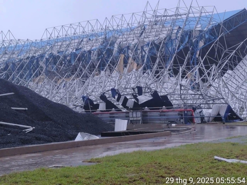 Mái nóc kho than ở Nhiệt điện Vũng Áng bị bão đánh sập – Ảnh: LQT.