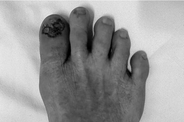 Znews đưa tin, bà L.T.P. (68 tuổi, Thanh Hoá) đến khám tại khoa Phẫu thuật Tạo hình thẩm mỹ và Phục hồi chức năng, Bệnh viện Da liễu Trung ương (Hà Nội). Triệu chứng ban đầu là ngón chân có mảng màu đen, loét, rỉ dịch, chảy máu và đau nhẹ.