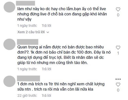 “Đi cứu trợ mà cũng tranh thủ bán hàng luôn. Khó hiểu ghê!”, “Đi từ thiện thì về nhà rồi bán hàng người ta ủng hộ cho em, đang đi mà với thiệu sản phẩm để bán là không đúng chỗ”, “Kiểu này giống lợi dụng nỗi đau của người ta hơn”, “Bán hàng là một chuyện nhưng chất lượng sản phẩm thế nào”, “Bán hộp sữa 800k xong tặng 1 – 2 triệu thấy khó tin quá”, “Chưa biết đúng sai thế nào nhưng mọi người làm gì cũng tỉnh táo nhé, kể cả giúp người”,… là một số bình luận từ cư dân mạng.