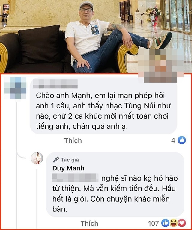 Mới đây, một lần nữa Duy Mạnh khiến mọi người phải tranh cãi khi trả lời câu hỏi liên quan đến Sơn Tùng. Cụ thể, 1 tài khoản để lại bình luận hỏi nam ca sĩ: “Chào anh Mạnh, em lại mạn phép hỏi anh 1 câu, anh thấy nhạc Tùng Núi như nào, chứ 2 ca khúc mới nhất toàn chơi tiếng Anh, chán quá anh ạ”.