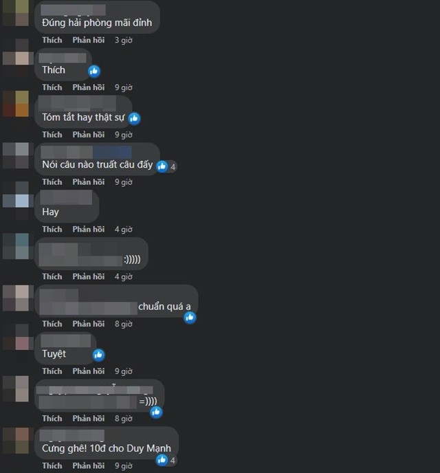 Riêng facebooker N.M đưa ra lời khuyên cho Duy Mạnh: “Sai đúng cũng là do con người tự đặt ra thôi. Em hiểu anh đang dùng facebook theo cái cách vui là được, nhưng ở Việt Nam khi anh phát ngôn có ảnh hưởng đến dư luận và lại đi ngược với những gì nhà chức trách hướng tới thì em nghĩ anh nên tiết chế”.