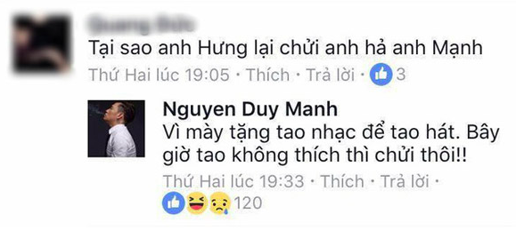 Sau đó, Duy Mạnh không ngại bày tỏ quan điểm của anh khi người hâm mộ nhắc tới giọng ca “Nắm lấy tay anh”. Dù không nêu đích danh nhưng các fan dễ dàng nhận ra cả hai ca sĩ đình đám đang nhắc đến đối phương. Người hâm mộ cho rằng, cả Duy Mạnh – Tuấn Hưng cần có cách ứng xử văn minh hơn thay vì dùng lời lẽ khiếm nhã trên mạng xã hội.