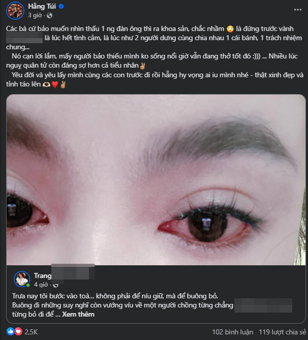 Chia sẻ của Hằng Túi lập tức nhận về hàng nghìn lượt cảm xúc, chia sẻ và bình luận. Nhiều người đồng tình khi cho rằng phụ nữ sau l:y h:ôn cần mạnh mẽ, yêu lấy chính mình, giữ tinh thần thật tốt mới có thể lo được cho con.