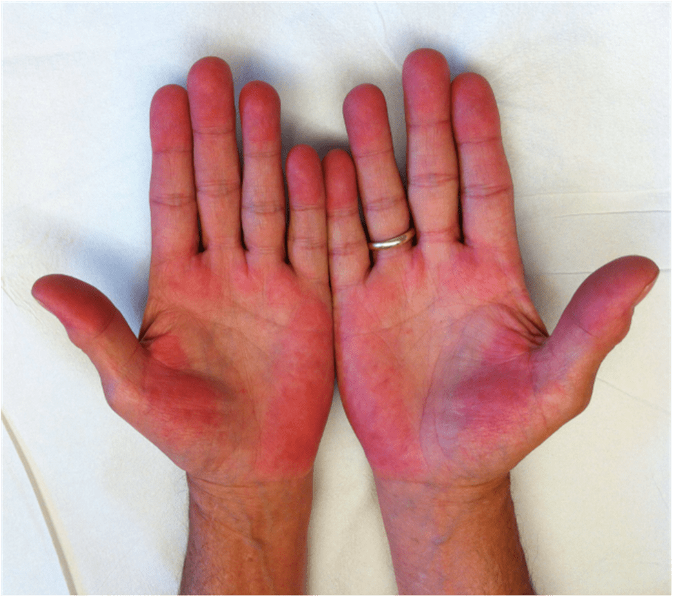 Tình trạng này sẽ khiến da ở các vùng đầu ngón tay và lòng bàn tay xuất hiện nhiều mảng màu đỏ nhưng chính giữa lòng bàn tay lại có màu trắng. Khi ấn vào vùng da bị đỏ, chúng sẽ chuyển sang trắng và chuyển lại về màu đỏ khi buông tay ra. Các vùng da bị đỏ ở lòng bàn tay không gây đau nhức hay bong tróc.