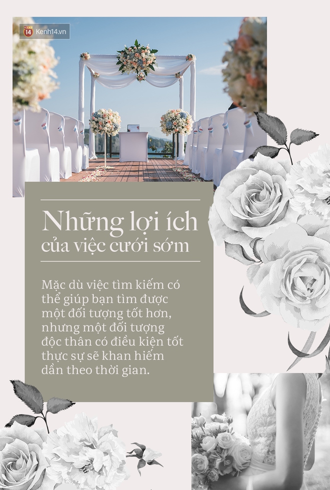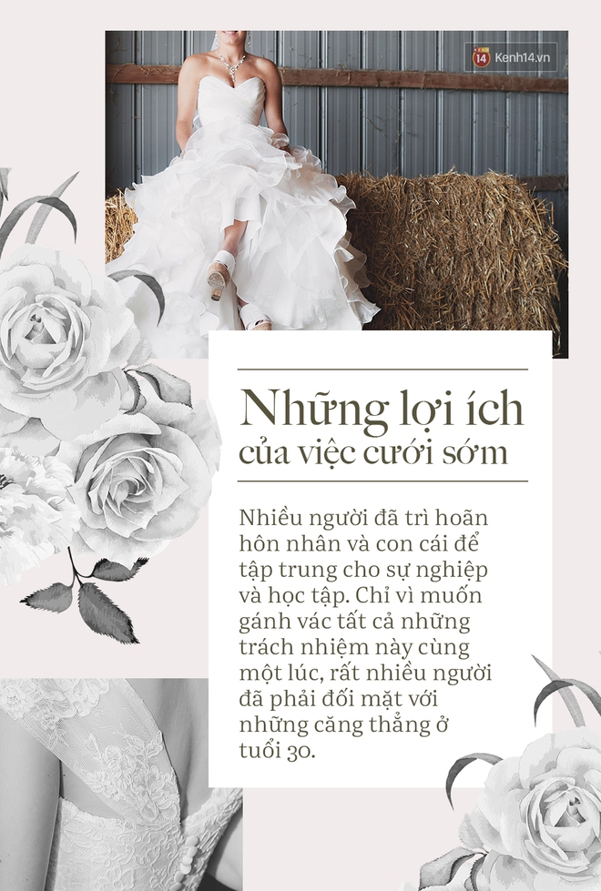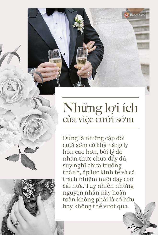 Mối băn khoăn về việc cưới sớm thời nay và ý kiến cho rằng nên trì hoãn việc cưới xin không phải xuất hiện một cách vô cớ. Nghiên cứu chỉ ra rằng những cặp đôi kết hôn trước năm 25 tuổi có xu hướng ly hôn nhiều gấp hai lần những cặp đôi kết hôn sau độ tuổi ấy.