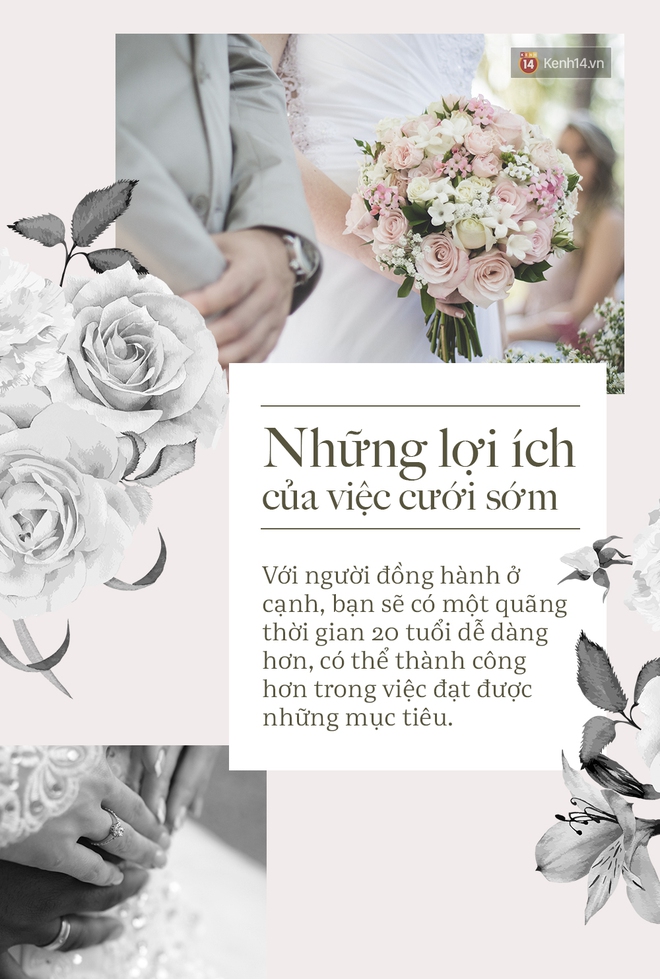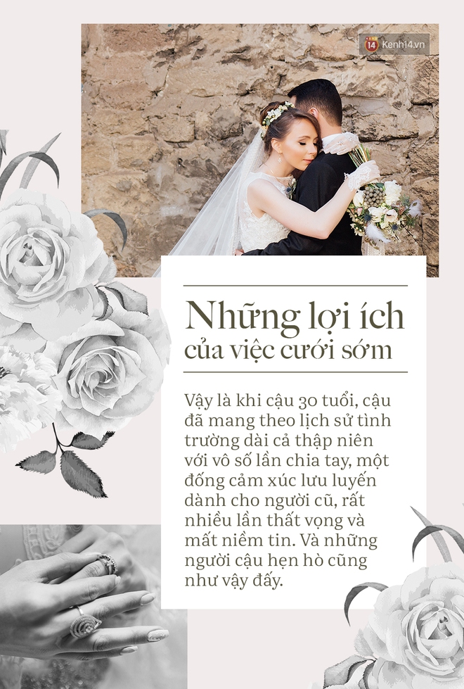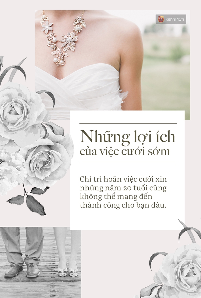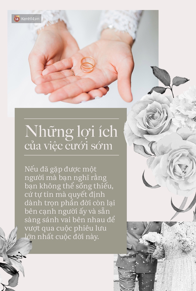 Không phải tôi đang cố chứng tỏ sự ưu việt của việc cưới sớm, với bài viết này, mục đích của tôi chỉ đơn giản là muốn trấn an những bạn trẻ đang ở trong độ tuổi đôi mươi, những người đã gặp được đúng người và cảm thấy mình đã sẵn sàng cho cuộc sống hôn nhân, nhưng vẫn chần chừ vì những câu rỉ tai “Cứ cưới sớm đi, kiểu gì mày cũng hối hận cho xem!”. Sự thật là, đừng sợ hãi, vì một nghiên cứu phân tích tuổi kết hôn và hạnh phúc đã kết luận: “Chỉ trì hoãn việc cưới xin những năm 20 tuổi cũng không thể mang đến thành công cho bạn đâu.”