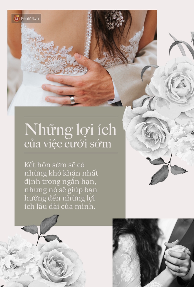 Rất nhiều người trì hoãn hôn nhân cho đến khi túi tiền của họ lên tiếng. Như chúng ta đã thấy ở trên, các vấn đề về tài chính có thể là căng thẳng trong các cuộc hôn nhân sớm. Tuy nhiên những khó khăn thách thức như vậy sẽ dần được cải thiện khi con người ta dần trưởng thành. Kết hôn sớm sẽ có những khó khăn nhất định trong ngắn hạn, nhưng nó sẽ giúp bạn hướng đến những lợi ích lâu dài của mình.