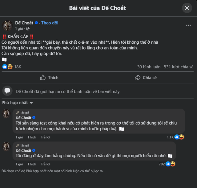 Tối 29/9, Dế Choắt gây hoang mang khi đăng status lên Facebook cá nhân, cho biết đang bị hãm hại. Cụ thể, nam rapper viết: “Khẩn cấp! Có người đến nhà tôi gài bẫy, thả ch:ất c:ấm vào nhà. Hiện tôi không thể ở nhà. Tôi không liên quan đến chuyện này và rất lo lắng cho an toàn của mình. Cần sự giúp đỡ, hãy giúp đỡ tôi”.