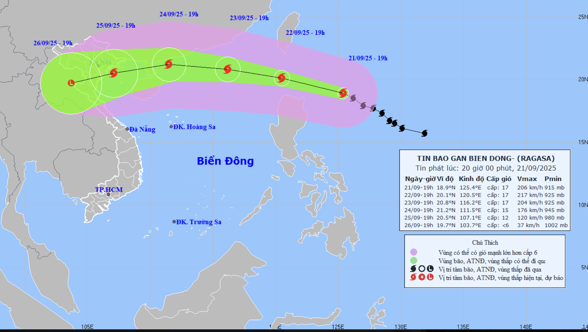 Theo Trung tâm Dự báo Khí tượng Thủy văn Quốc gia, hồi 4 giờ ngày 23.9, vị trí tâm siêu bão số 9 Ragasa ở khoảng 19,8 độ vĩ bắc; 118,8 độ kinh đông, trên vùng biển phía đông bắc của khu vực bắc Biển Đông.