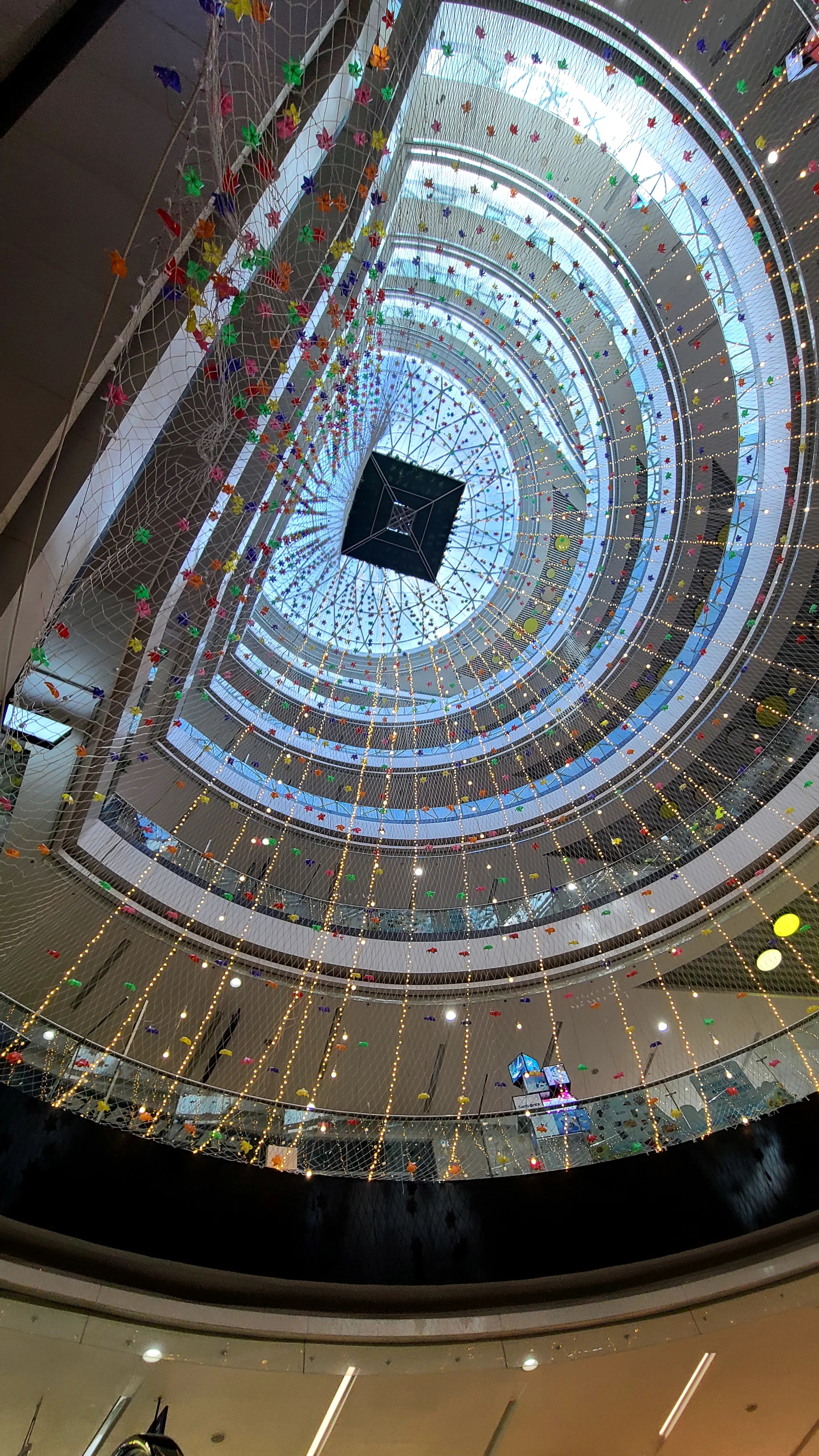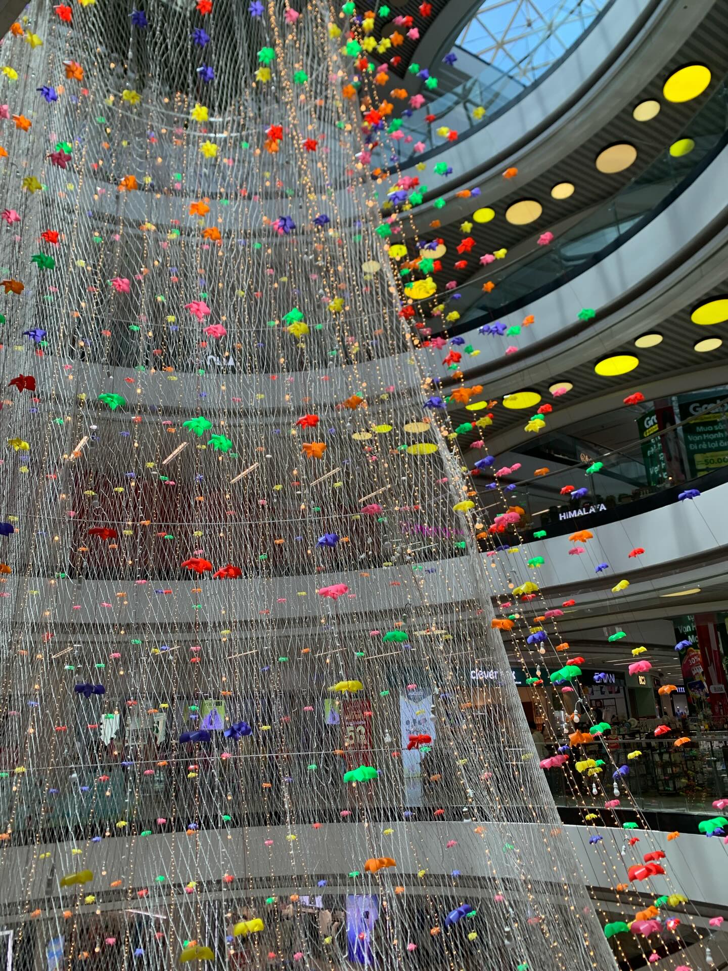 Lúc này, những dải đèn màu vàng được lồng vào lưới an toàn bật sáng, đan xen là những bông hoa giấy đủ màu khiến không gian trung tâm thương mại (TTTM) này thêm phần bắt mắt.