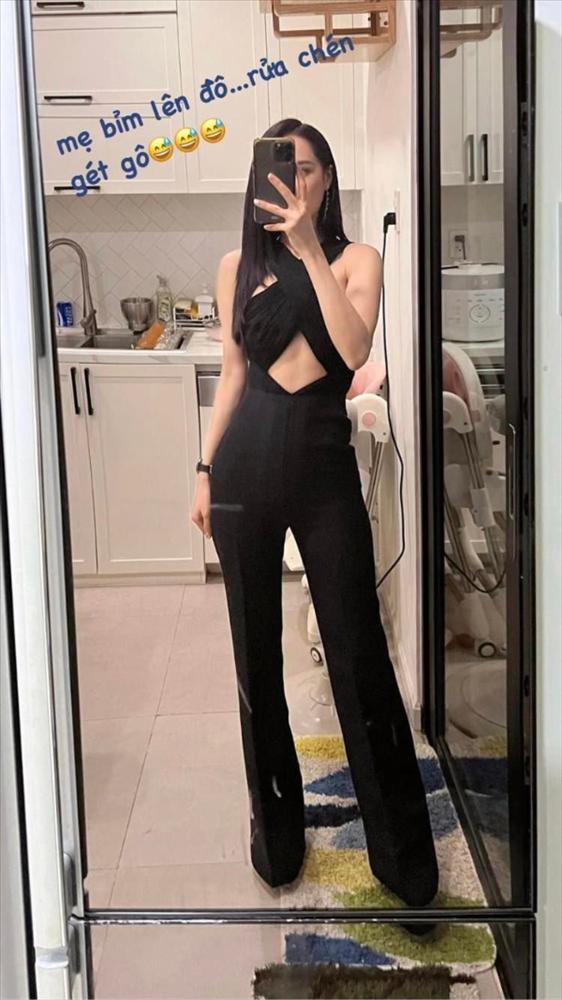 Một ngôi sao khác cũng từng diện chiếc jumpsuit đen “đắt show” này, đó chính là Vy Pumpe – bà xã của diễn viên hài Mạc Văn Khoa. Vy Pumpe không kết hợp với quá nhiều phụ kiện mà chỉ mang theo một chiếc túi box mini và đính kèm một ghim cài áo tạo điểm nhấn ở phần ngực.